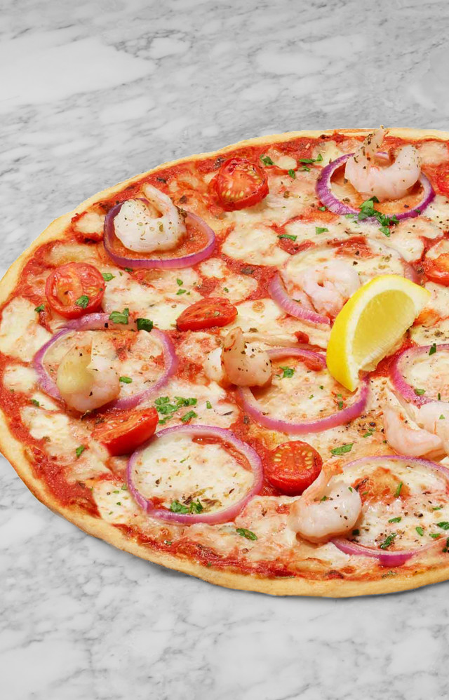 Prawns with tomato and garlic, mozzarella, red onion and baby plum tomatoes, fresh parsley and a squeeze of lemon