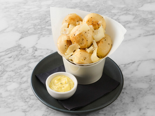 Truffle garlic butter coated Dough Balls with Gran Milano cheese and extra truffle butter for dipping